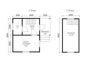Проект 2 дома из бруса . Общая площадь полутораэтажного здания составляет 29.79 кв.м., размер – 5х4 м..